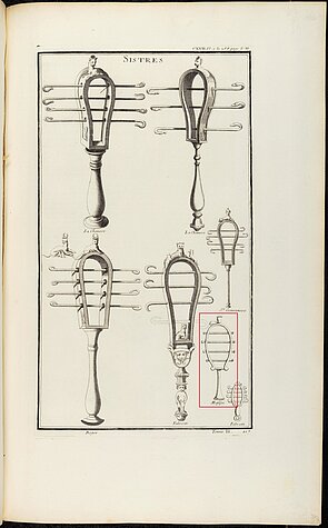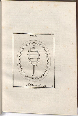 Und auch wenn ein ovaler Bildrahmen nicht immer ein verlässlicher Hinweis ist – wie etwa die Abbildung eines ungerahmten Sistrums verdeutlicht (Abb. 2; ThesaurusID 1467968) –, ist eine zuverlässige Information, die alle Gemmen-Abbildungen bei Montfaucon gemein haben, die Angabe der Bildquelle. Die Vorlagen, nach denen Montfaucon seine Abbildungen hat stechen lassen, werden dadurch also ersichtlich. Neben solchen mit der Quellenangabe „Beger“, „La Chausse“ oder „Capello“, steht an insgesamt 214 Gemmen-Illustrationen die Angabe „Maffei“. Dieser Quellengruppe schenkt der folgende Beitrag besondere Aufmerksamkeit.