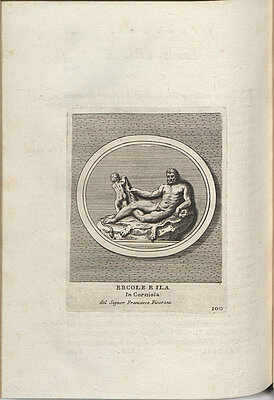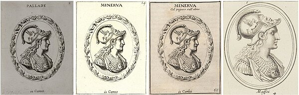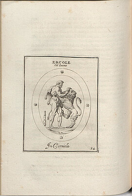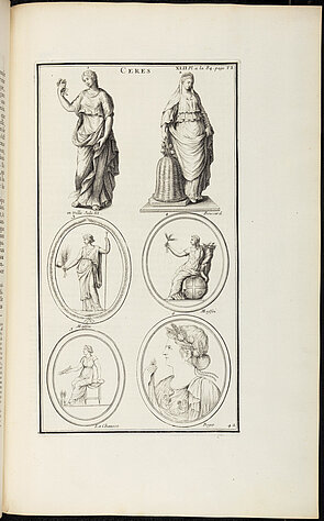 Die geschnittenen Schmucksteine sind in dem von Bernard de Montfaucon (1655–1741) kuratierten Bilderatlas L'antiquité expliquée et représentée en figures (1719) und den zugehörigen Supplément-Bänden (1724) trotz ihrer oftmals abstrahiert-vergrößerten Darstellung meist leicht an einer ovalen Doppelrahmung zu erkennen (Abb. 1; ThesaurusID 23881044). Da Montfaucon in seiner Zusammenstellung die antike bzw. für antik gehaltene Kunst nicht nach Gattungen ordnet, sondern grundsätzlich die Bildmotive und -themen in den Vordergrund der Betrachtung stellt, finden die geschnittenen Steine ihren neu dimensionierten und dadurch gleichberechtigten Platz zwischen Altären, Statuen, Reliefs, Kandelaberbasen, Rollsiegeln und Münzen. Dabei fällt auch der Materialität oder einer genaueren Klassifikation, ob es sich bei den Schmucksteinen um vertieft geschnittene Intaglien oder erhabene Kameen handelt, keine größere Bedeutung zu. Im Folgenden wird daher auf den Oberbegriff Gemme zurückgegriffen. [1]
