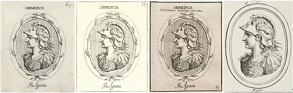 [20] 85 der nach „Maffei“ kopierten Abbildungen hatte Francesco Faraone Aquila für Maffeis Gemme antiche figurate neu angefertigt, 25 Abbildungen mit der Angabe „Maffei“ stammen ursprünglich aus der Enea Vico zugeschriebenen Grimani-Serie und 2 „Maffei“-Abbildungen beruhen auf Tafeln, die zuerst durch Pietro Stefanoni publiziert worden waren.