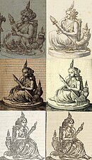 Neapel, BNN, Ms. XIII.B.7, Fol. 26r; Paris, BnF, Ms. Français 382, Fol. 9r; Goropius 1580, S. 49; Herwart von Hohenburg [um 1610], Titelblatt; Kircher 1650, S. 316; Kircher 1652-54, Bd. 3, S. 590 (Fotos: BNN Neapel, BnF Paris, BSB München, SUB Göttingen, UB Heidelberg)
